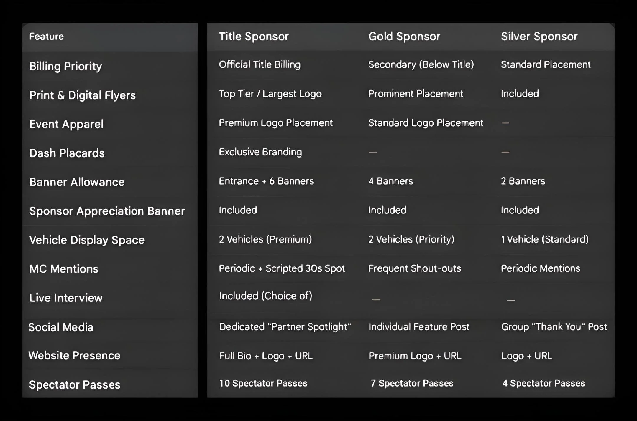 This is our most accessible tier, designed to get your brand "in the room" and on the official flyer. You get a dedicated vehicle spot to talk one-on-one with attendees, which is where the best networking happens.